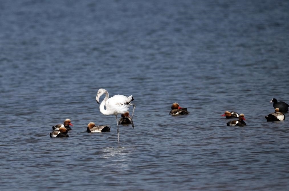 大紅鸛又稱大火烈鳥,主要生活在鹽水、淡水棲息地,喜歡結群生活,主要分布于熱帶、亞熱帶地區(qū),已被列入國家保護的有益的或者有重要經濟、科學研究價值的陸生野生動物名錄。陳峰說:“大紅鸛在烏梁素海屬于‘迷鳥’,實屬罕見。我們已安排專人在湖區(qū)周邊實行重點巡查,防止人類活動干擾大紅鸛的棲息,給它營造出適宜、安全的棲息環(huán)境?!?/p>