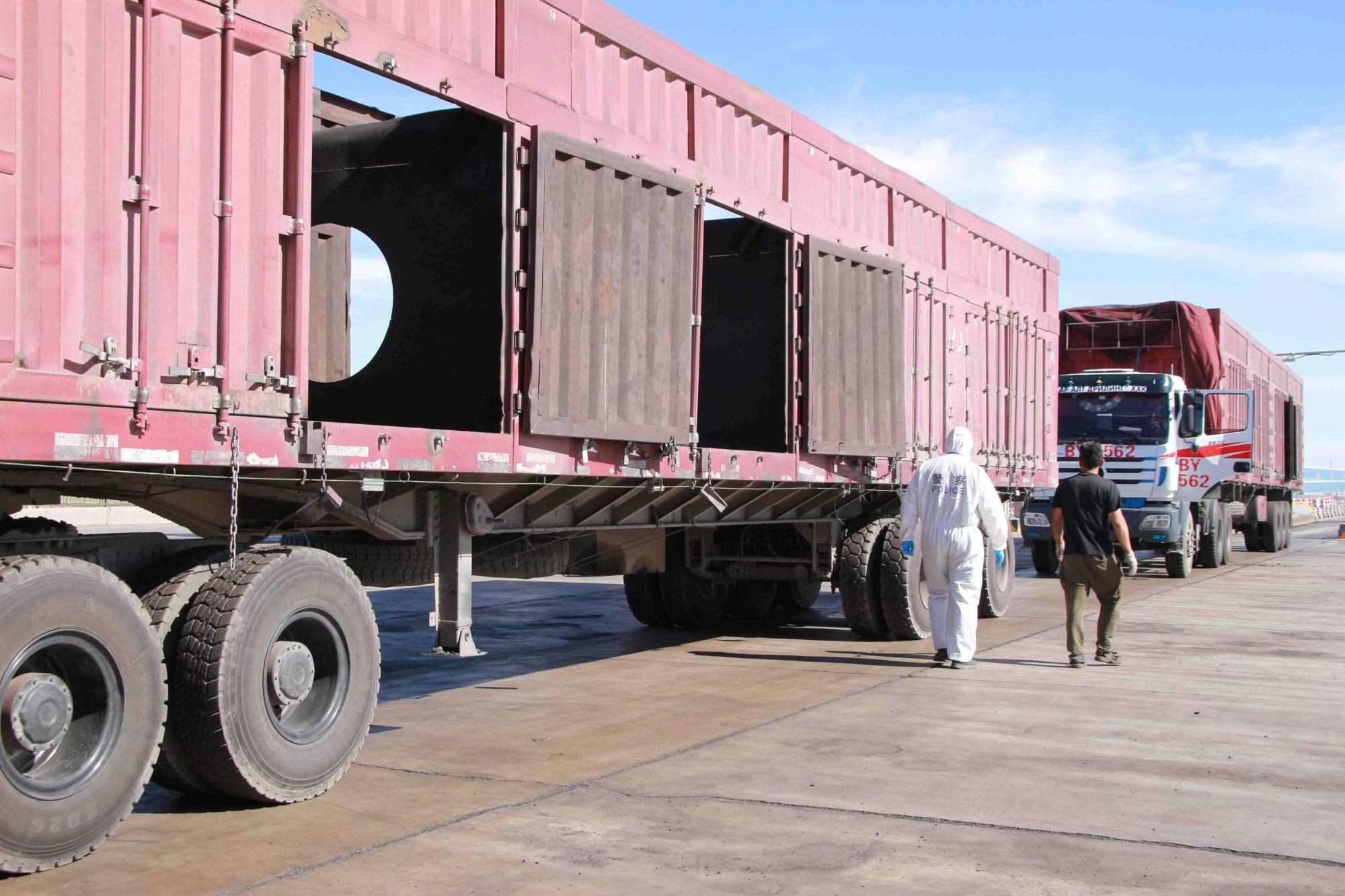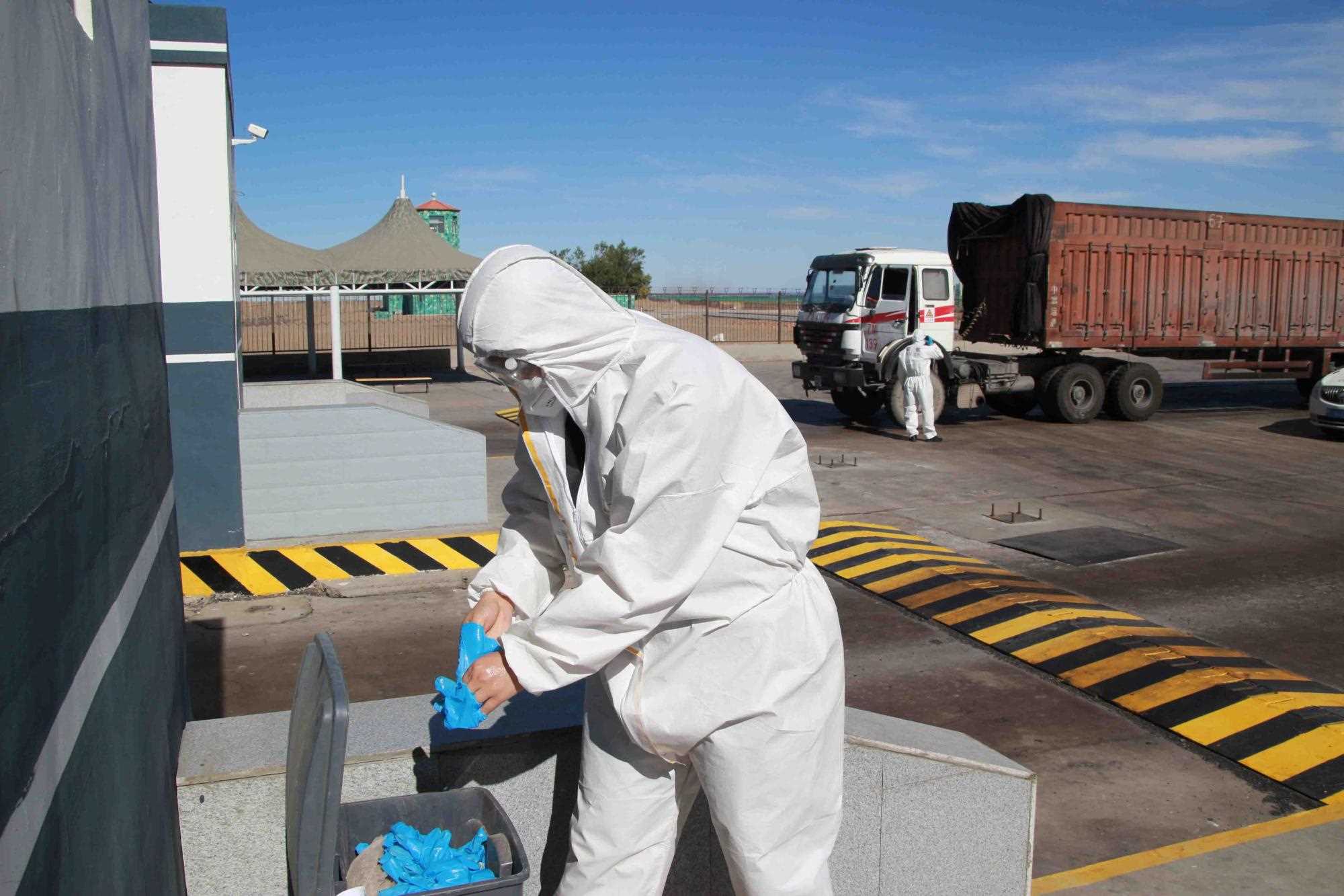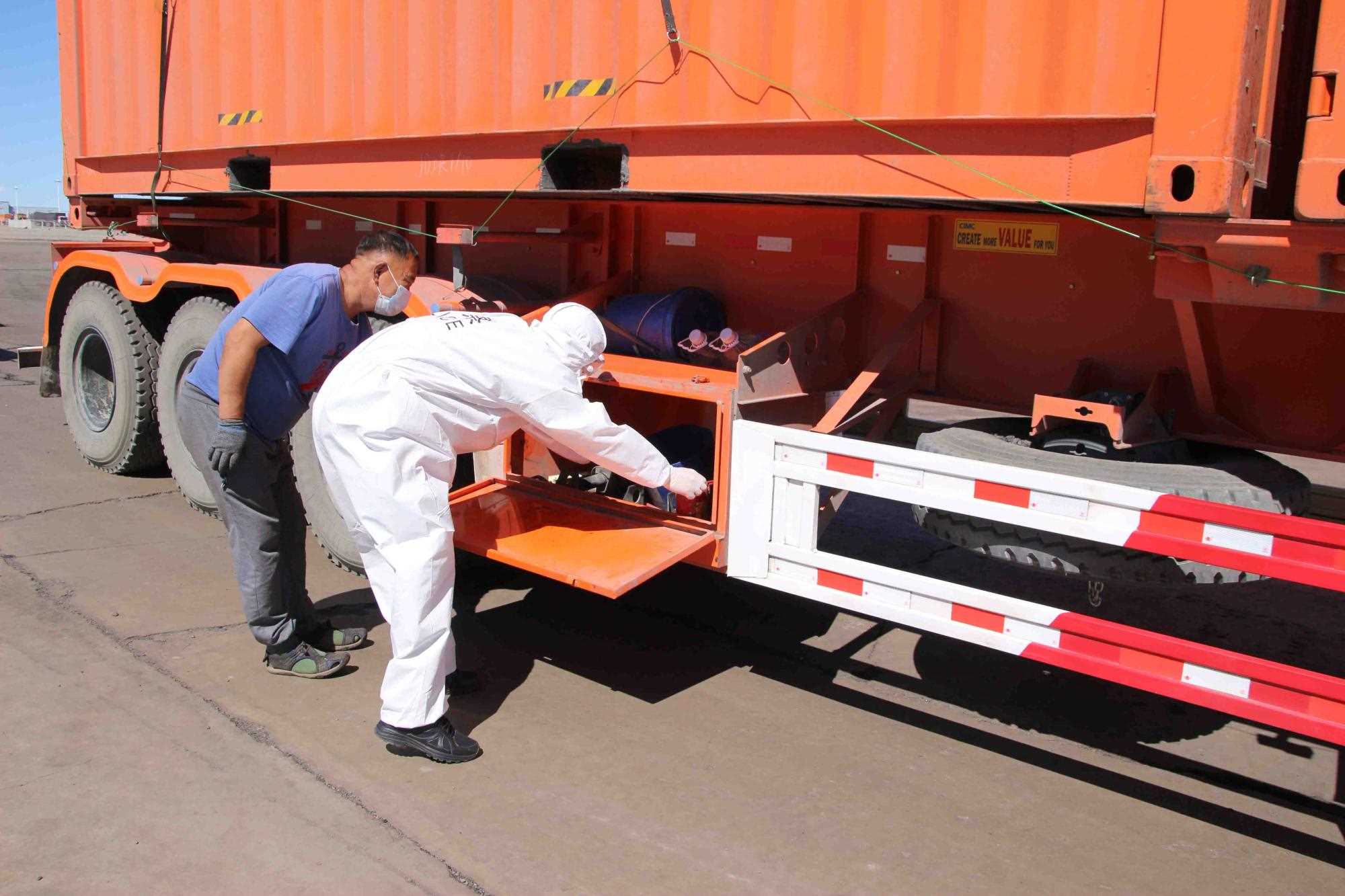 近期策克口岸的溫度持續(xù)增加至30攝氏度以上,而在通行的重型卡車,溫度還要更高,下午15點(diǎn)溫度計(jì)地表溫度測(cè)量最高可達(dá)40攝氏度。這無疑讓的查驗(yàn)工作更為繁重。更重要的是,由于疫情影響每名民警在查驗(yàn)期間都要穿上防護(hù)服,在高溫下,由于防護(hù)服是密閉的,防護(hù)服里仿佛成了蒸箱,用不了十分鐘,民警就會(huì)汗流浹背,防護(hù)服黏在身上又粘又癢,一班勤務(wù)近2個(gè)小時(shí),必須要等過了勤務(wù)才能休息,而民警還要完成車體的查驗(yàn)工作,包括工具箱、馬槽等處,絲毫不敢馬虎。