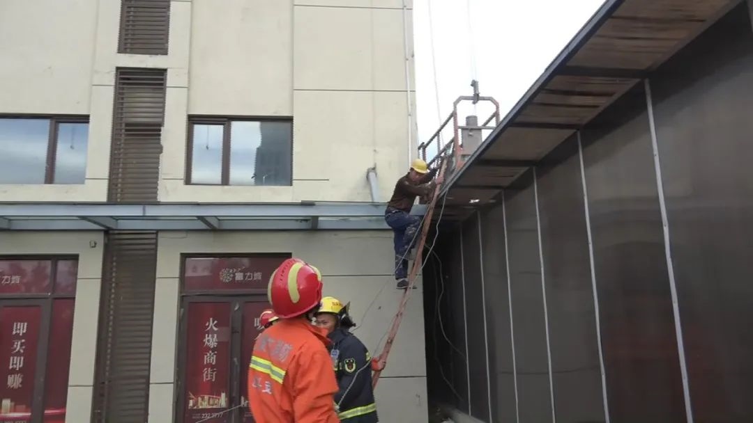 指揮員立即命令第一營救小組前往建筑內(nèi)部,試圖通過住戶窗戶進(jìn)行營救,當(dāng)營救小組到達(dá)指定位置后發(fā)現(xiàn),消防隊員與被困工人相距太遠(yuǎn),空中營救的危險性和困難程度較高。消防隊員通過與被困工人交流,提醒他抓好繩索,安撫他的情緒。很快,第二組營救的消防隊員利用掛鉤梯爬到二層位置把纏繞的鋼絲繩拉到地面,4人分別拽一根鋼絲繩,松解纏繞的鋼絲繩,使升降機恢復(fù)運行。而此時,天氣逐漸放晴,風(fēng)力也開始減弱,在消防隊員們的努力下,升降機緩緩下降,18時12分,被困的工人安全降落到地面。