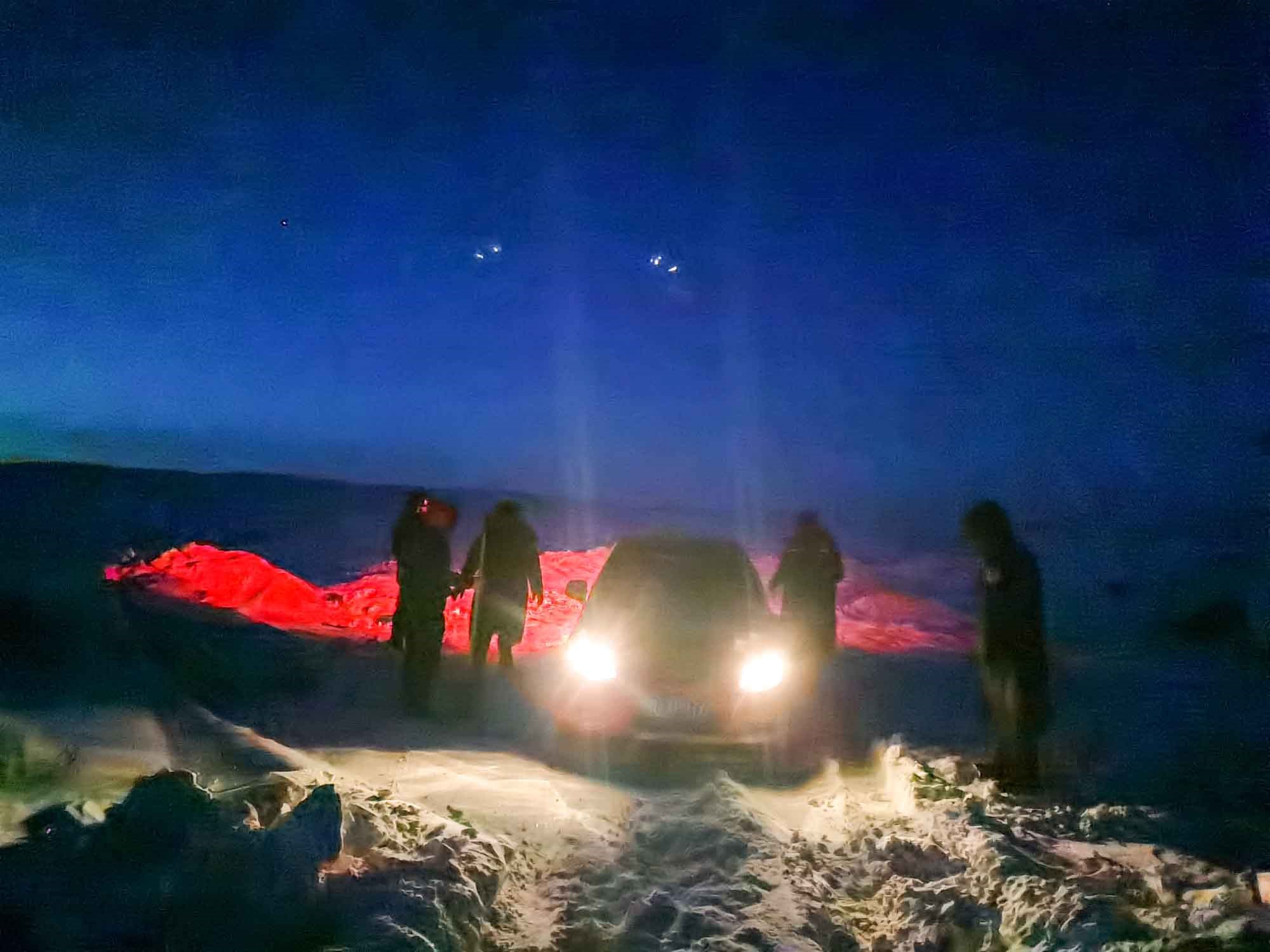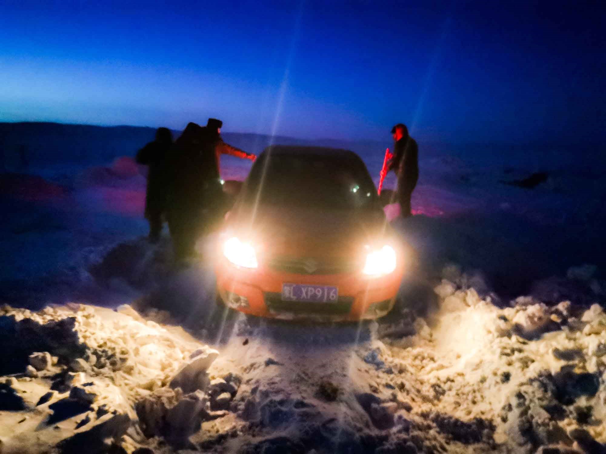 1月17日17時,那木吉拉與弟弟一同駕車返回百靈廟鎮(zhèn),在途經(jīng)一處被風谷地時,由于晚上視線較差,且此處坡度較大,不慎陷入雪中無法動彈,只得撥通電話請求派出所救助。草原上沒有遮蔽物,常常到了下午就刮起大風,吹得積雪覆蓋在土地上分不清地勢高低,民警們按著平日下鄉(xiāng)走訪的經(jīng)驗摸索前進,經(jīng)過近一小時才到達現(xiàn)場,了解情況后,民警們將準備好的熱水和棉大衣遞給牧民便展開了救援工作。在零下35度的冬夜里,民警們用鐵鍬和雙手經(jīng)過近兩個小時的奮戰(zhàn)終于將40厘米厚的積雪清理干凈,并將被困車輛通過前拉后推的方式移至平坦區(qū)域。