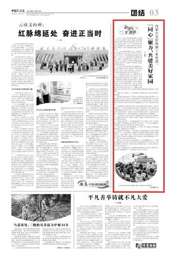 2025年12月2日,《中國民族報》第3版刊發(fā)題為《內(nèi)蒙古達(dá)拉特旗工業(yè)街道:“同心”聚力,共建美好家園》的文章,報道了內(nèi)蒙古達(dá)拉特旗工業(yè)街道以“同心共建、同心共學(xué)、同心共事、同心共樂”的“四心四共”工作法賦能基層治理。打造“同心向暖·花開工業(yè)”民族工作品牌,將民族團(tuán)結(jié)融入基層治理各環(huán)節(jié),奏響了開放包容、融榮共居的和諧樂章。