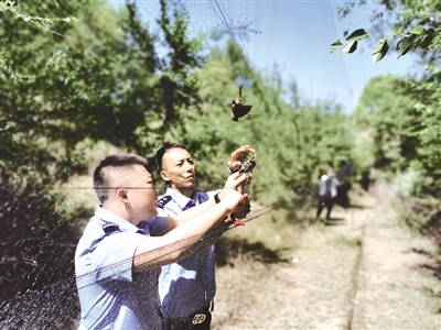 民警在周邊偵查,尚未發(fā)現(xiàn)可疑實(shí)施人員,民警及時(shí)對網(wǎng)上受困的野鳥進(jìn)行了解救和放飛,并對該處粘鳥網(wǎng)進(jìn)行了拆除、銷毀。