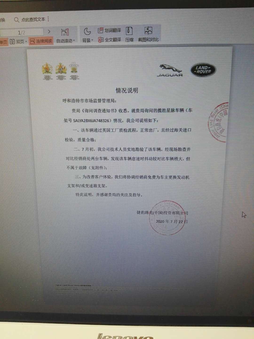 在多個車輛專區(qū)的貼吧里,均有關(guān)于該車型抖動,共振的情況反映。2019年,杭州30多名路虎星脈車主因為車輛共振導(dǎo)致耳鳴的問題,還共同趕到路虎上??偛考w維權(quán)。此事經(jīng)杭州媒體全程曝光,引起廣泛關(guān)注。盡管如此,捷豹路虎(中國)投資有限公司給出的答復(fù)和此次給呼和浩特市市場監(jiān)督管理局的《情況說明》如出一轍,都表示非質(zhì)量問題。