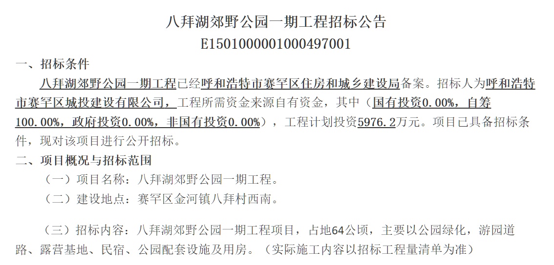 7月5日,記者從呼和浩特市公共資源交易監(jiān)督管理局了解到,八拜湖郊野公園一期工程已經(jīng)呼和浩特市賽罕區(qū)住房和城鄉(xiāng)建設(shè)局備案,項目已具備招標(biāo)條件,啟動公開招標(biāo)。