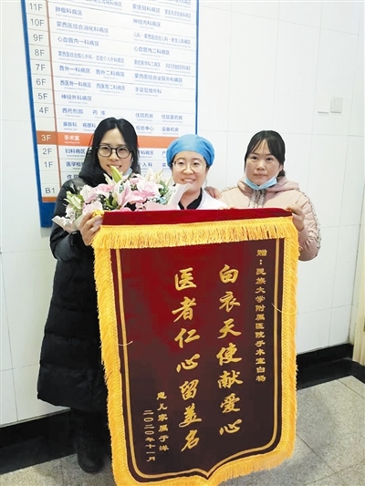 11月27日,當(dāng)孩子已經(jīng)好轉(zhuǎn)出院,王欣影沒有忘記那一夜遇到的好心人,她再一次撥通白楊的電話,此時,她才得知白楊就是附屬醫(yī)院手術(shù)室的一名護士。她將一面寫有“白衣天使獻愛心醫(yī)者仁心留美名”的錦旗送到了白楊的手中,她說:女兒又多了一位媽媽。白楊也向記者講起了那晚的經(jīng)歷,她說:“其實,那晚我是去接我丈夫的,由于暴雪,丈夫被困在了米家科技園附近,我開車去接他,在回來的路上,看到有車輛遇險,心想,這樣惡劣的天氣,遇到誰有困難就應(yīng)該幫一把,當(dāng)時,我們也沒有多想,我也是做母親的,看到夫妻倆那么焦急,我只想把孩子快點送到醫(yī)院,好在有驚無險,孩子平安無事?!焙髞?,記者還了解到,當(dāng)把孩子送到醫(yī)院后,白楊已渾身濕透,待孩子已經(jīng)搶救上,安頓好王欣影后,已經(jīng)是凌晨5點,天也蒙蒙亮了,白楊沒有回家,一夜未眠的她,留在了工作崗位上。