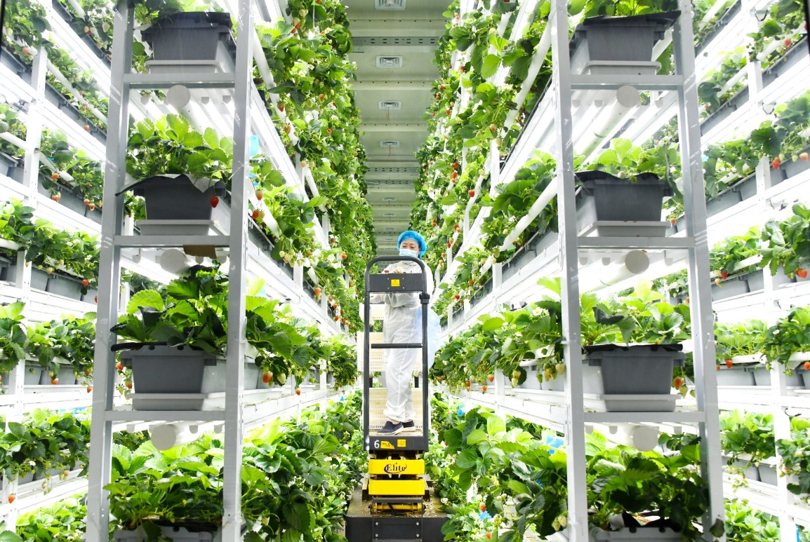 在工作人員的帶領(lǐng)下,記者來到了無菌種植車間。車間內(nèi),四列八層垂直栽培架拔地而起,茂密枝葉間,一顆顆草莓俏皮地探出頭來,紅的熱烈、粉的溫柔,點綴其間。“嗡嗡”聲中,身披絨毛的熊蜂穿梭于植株間,時而停駐花朵,為授粉而忙碌不停。工作人員身穿防護服,乘坐高空升降車,熟練地進行采摘。車間內(nèi),沒有土壤、沒有陽光,卻處處涌動著生命的蓬勃。