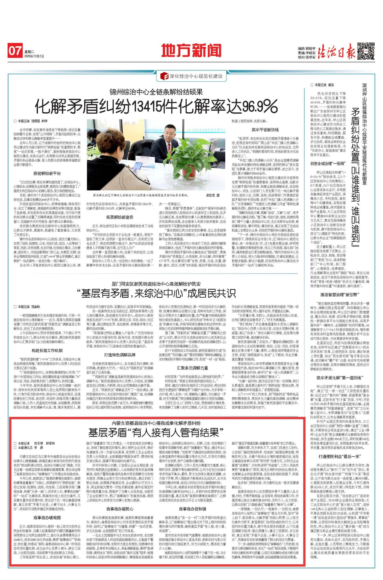 2025年12月2日,《法治日報》第7版刊發(fā)題為《內(nèi)蒙古商都縣綜治中心攥指成拳化解矛盾糾紛 基層矛盾“有人接有人管有結(jié)果”》的文章,報道了內(nèi)蒙古商都縣以“商都的事情在商都辦、商都的事情商量著辦”為核心,聯(lián)動公安局、檢察院、法院、司法局、工信局等多部門攥指成拳,構(gòu)建“只進一扇門、訴求有人辦、事事依法解”的“一站式”化解體系,用實際行動筑牢轄區(qū)和諧穩(wěn)定防線。