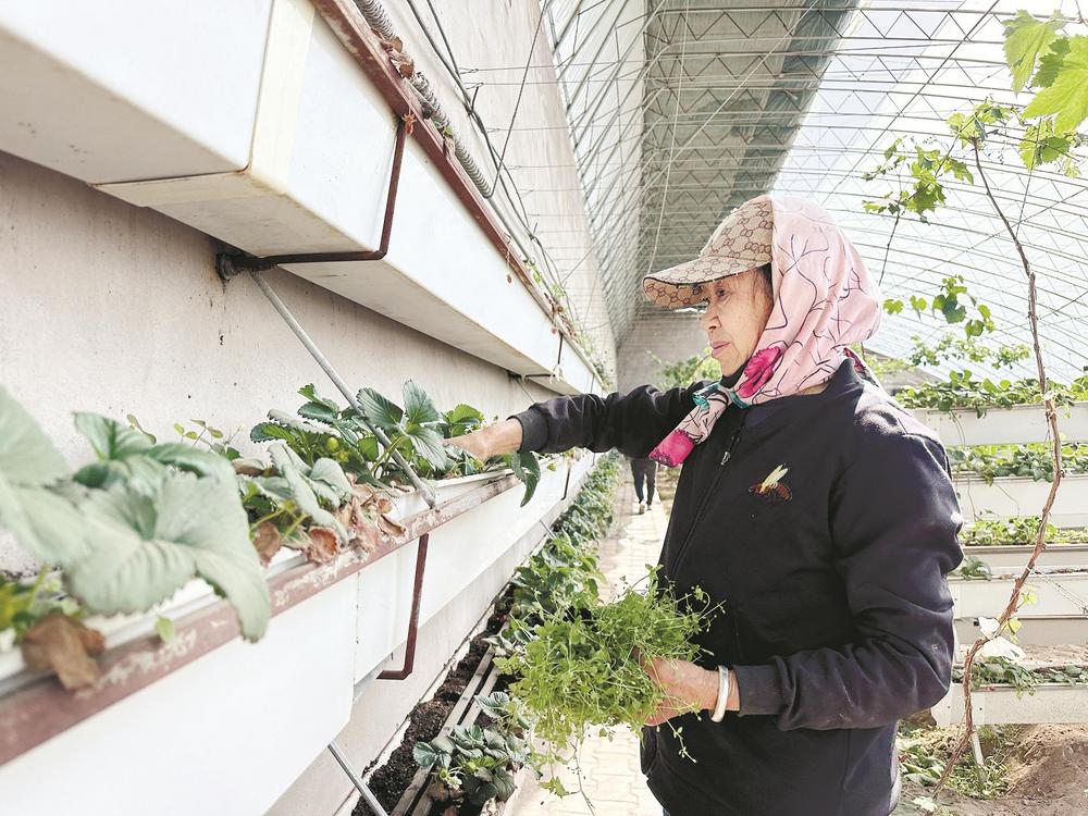 走進草莓大棚內(nèi),濃濃的暖意撲面而來。抬眼望去,離地一米多的種植架上種滿了生機勃勃、長勢喜人的草莓;穿梭在種植架間,一顆顆鮮紅欲滴、圓潤飽滿的草莓宛如璀璨的紅寶石,從綠葉間“探出頭”來,高高地懸掛在空中,散發(fā)著誘人的清香。種植戶牛尚海正在察看采用立體栽培技術(shù)的草莓長勢情況。“這是一種三維立體種植方式,能夠充分利用空間和光照,大幅度提高生產(chǎn)效率。以前一畝地最多種8000株,現(xiàn)在能種2.4萬株,產(chǎn)量提高了3倍,而且草莓個頭更均勻,賣相更好?!迸I泻8嬖V記者,這種種植方式不僅省工、省力,還降低了勞動強度,摘草莓也不用彎腰了。此外,這種種植模式比傳統(tǒng)種植模式每畝節(jié)水50%。