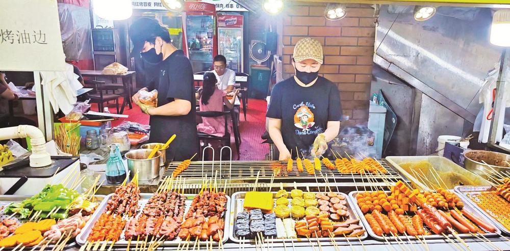 炭火上的羊肉串嗞嗞作響,油脂滴落,迸出金色火花,散發(fā)出誘人的香氣。客人圍坐在塑料小桌旁,手里拿著冰鎮(zhèn)啤酒,碰杯傳出清脆的響聲……這里沒有高檔餐廳的拘謹(jǐn),只有朋友相聚的歡樂和大口吃肉的暢快。大學(xué)生徐瑞虹放暑假后,經(jīng)常和朋友來夜市消暑?!拔覀儙讉€沒事就來萬達(dá)金街轉(zhuǎn)一轉(zhuǎn),天太熱了,待在家里也悶,而且夜市里的這些小吃我們都比較喜歡,沒事幾個人喝幾瓶啤酒,聊一聊天,感覺還是很愜意的?!睂τ谀贻p人來說,夜市不僅是美食的聚集地,更是釋放壓力、享受生活的好去處。在這里,他們可以暫時拋開煩惱,盡情享受美食帶來的快樂。