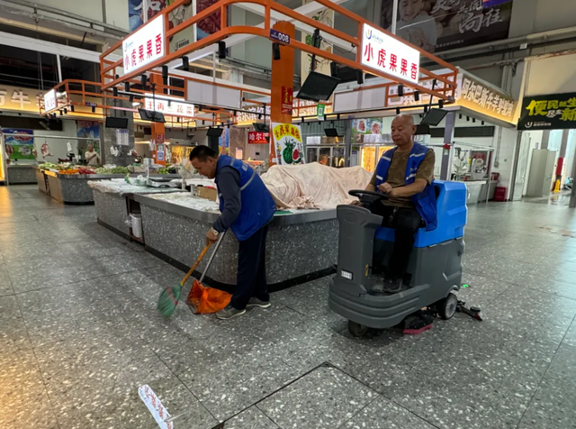 “我們每天都這樣,等市場關(guān)門后就進行徹底清掃?!绷_全貴一邊操作著洗地機,一邊對記者說,“我們這洗地機每天保證3次清掃,其余時間就靠人工不間斷地打掃,一定要讓市場保持整潔干凈。”
