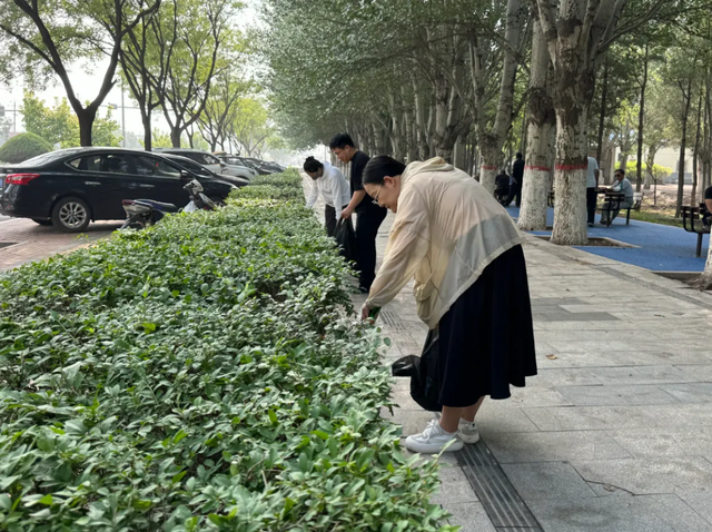 現(xiàn)場,大家迅速分工,有的拿著垃圾袋撿拾路邊的煙頭、紙屑等垃圾;有的拿著抹布,認真地擦拭公交站牌和果皮箱;還有的則在清理路邊綠化帶里的雜物。大家各司其職,干勁十足,不一會兒就汗流浹背。