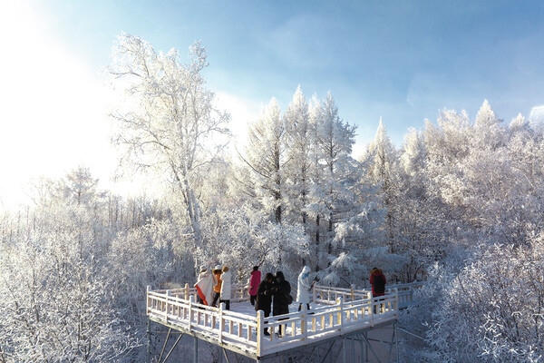 冬天的阿爾山,千里冰封,萬里雪飄,呈現(xiàn)出一片純凈無瑕的白雪世界。晶瑩剔透的霧凇裝點其間,宛如冰雪童話。藍(lán)天映襯下,霧凇閃耀著銀白光芒,群山峻嶺被冰封玉塑,更有一道彩虹橫跨山巔,美不勝收。木棧道深入森林,所見皆是雪與霧凇交織的白茫茫景象。漫步其間,穿越過膝積雪,那玉樹瓊花、銀光閃爍的壯美雪景讓人流連忘返。 (記者 畢力格 攝)