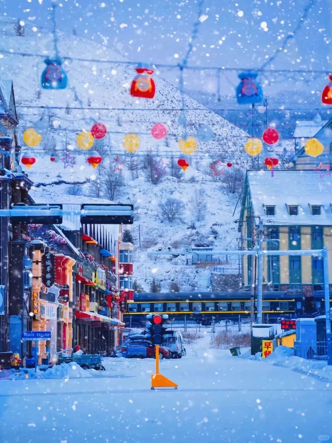 登上白狼峰觀景臺,俯瞰一望無際的林海雪原,夕陽西下時,整片雪原被染成溫柔的金色,寒風(fēng)掠過,雪花漫舞,這一刻的壯闊,足以治愈所有煩惱。走進(jìn)阿爾山雪村,木刻楞房頂著圓滾滾的“雪蘑菇”,紅燈籠在白雪中搖曳,晚上燈光一亮,暖黃色的光灑在雪上,感覺自己在童話里 。