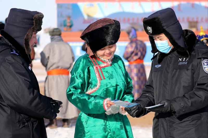 錫林郭勒邊境管理支隊達(dá)來、洪格爾、巴音都蘭等3 個邊境派出所共派出20多名警力,對于前來參加那達(dá)慕的人們進(jìn)行嚴(yán)格檢查,并向牧民群眾講解當(dāng)前面臨的新冠肺炎疫情防控形勢,發(fā)放宣傳冊。(內(nèi)蒙古日報記者 巴依斯古楞 攝影報道)