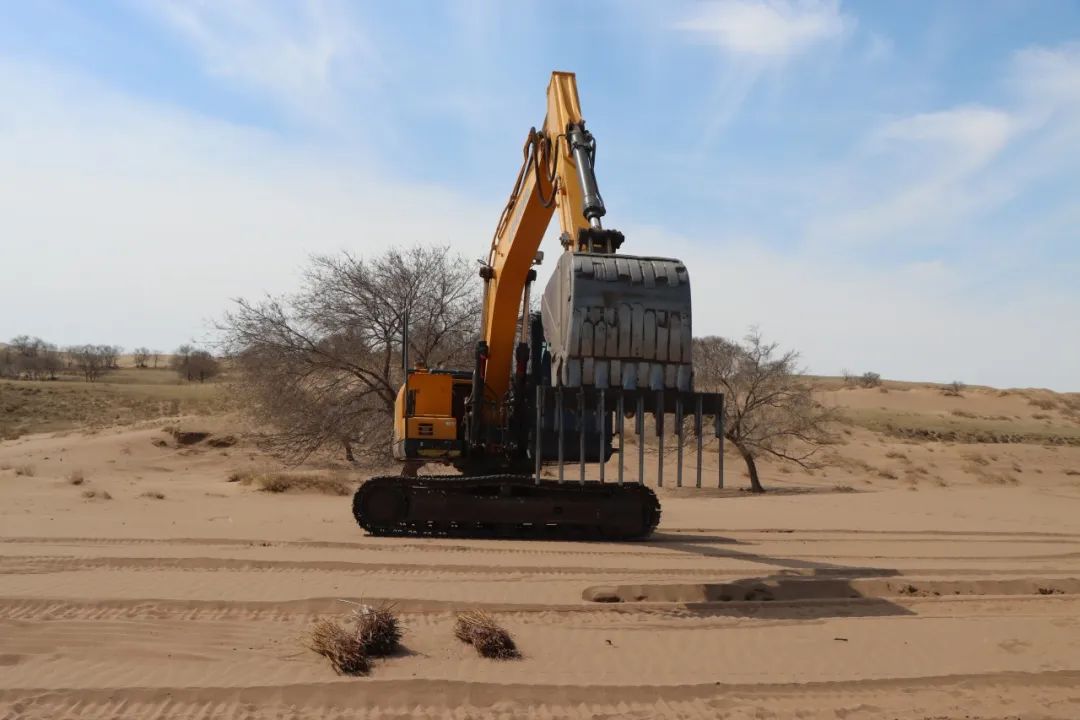 據(jù)錫林浩特市二蛋牧民養(yǎng)殖專業(yè)合作社負責人介紹,在傳統(tǒng)的沙漠治理作業(yè)中,工人需要手動栽植黃柳等固沙植物。然而,人工種植不僅效率低,勞動強度也大。為突破這一困境,合作社成員經(jīng)過多次試驗,最終決定對挖掘機進行創(chuàng)新改造,加裝叉具,這一巧妙的設計不僅實現(xiàn)了對黃柳種植深度和間距的精準把控,還能有效避免土壤翻動,最大程度地保持了土壤水分,切實保護了沙地的生態(tài)環(huán)境?! ?/p>