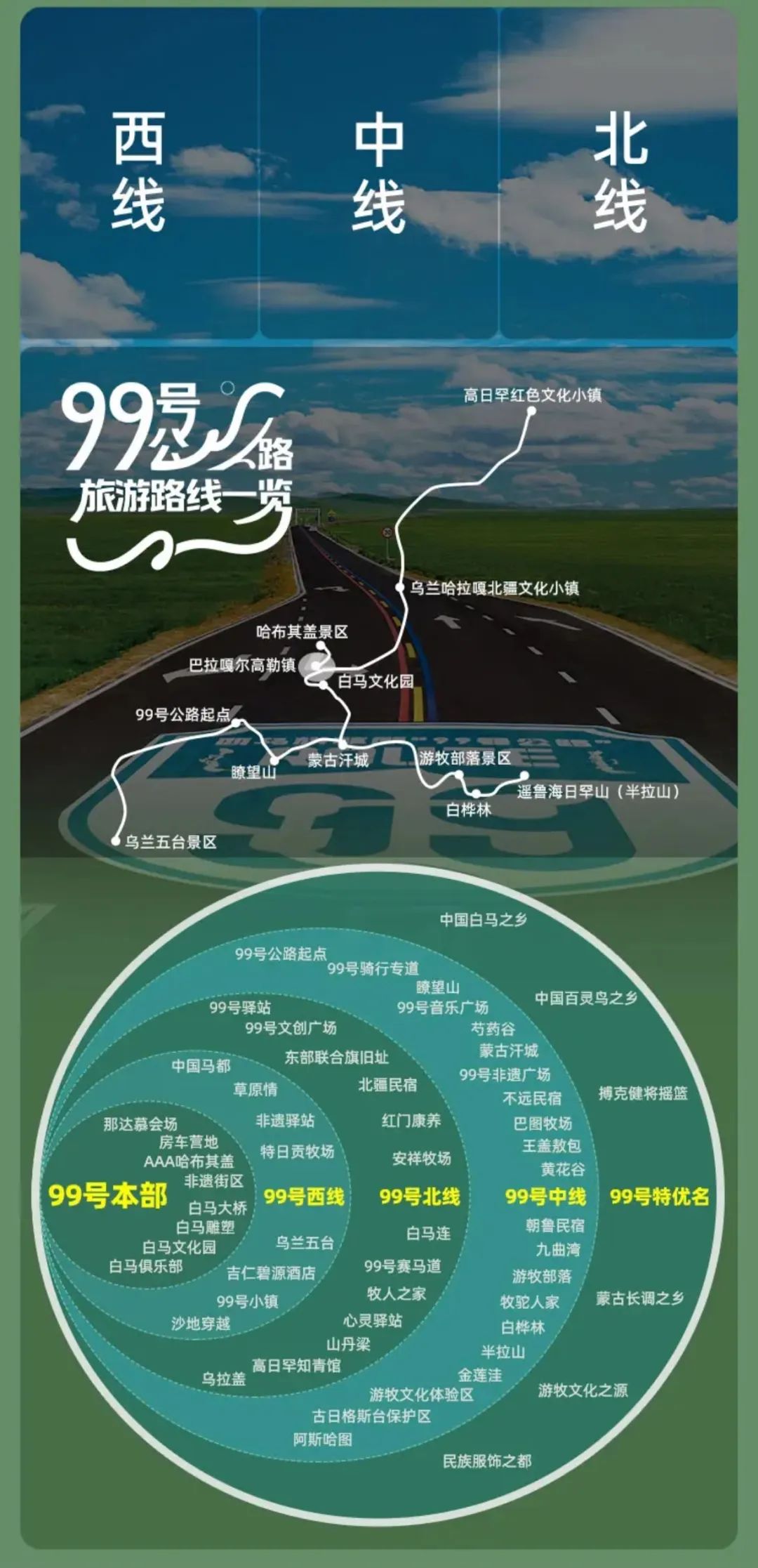 西烏旗草原“99號(hào)公路”分為西線(xiàn)、中線(xiàn)和北線(xiàn)
