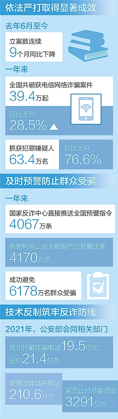據(jù)介紹,全國(guó)公安機(jī)關(guān)深入開展“云劍”“長(zhǎng)城”“斷卡”“斷流”“5·10”等專項(xiàng)行動(dòng),先后組織開展150次全國(guó)集群戰(zhàn)役。一年來,共破獲電信網(wǎng)絡(luò)詐騙案件39.4萬起,抓獲犯罪嫌疑人63.4萬名,同比分別上升28.5%和76.6%。根據(jù)最新統(tǒng)計(jì),電信網(wǎng)絡(luò)詐騙立案數(shù)連續(xù)9個(gè)月同比下降,打擊治理工作取得顯著成效。