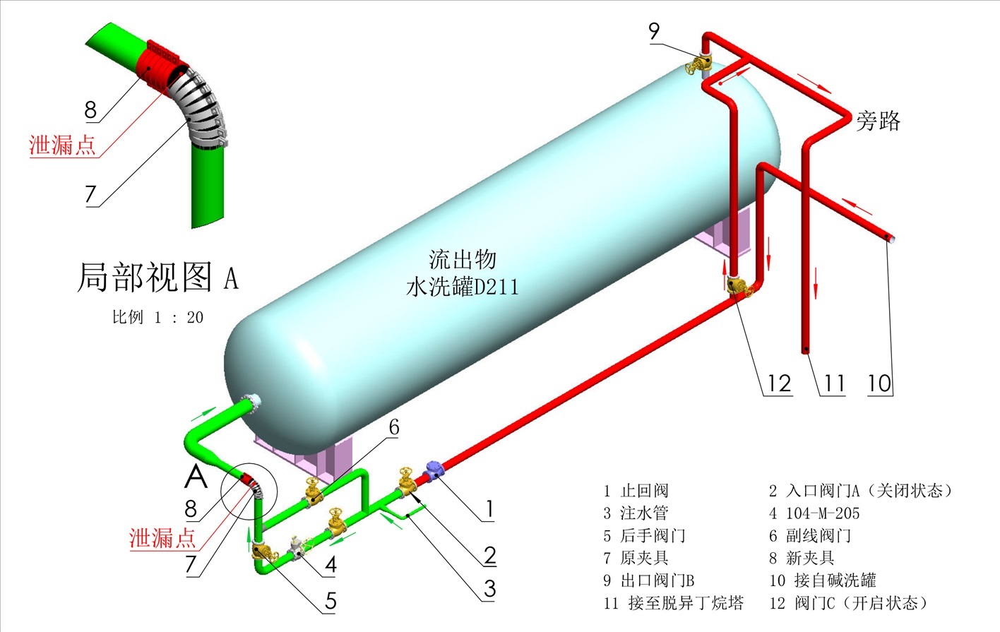 2023年1月11日,浩業(yè)化工發(fā)現(xiàn)事故管道彎頭夾具(2022年4月19日泄漏位置)邊緣處泄漏,浩業(yè)化工設(shè)備部組織進(jìn)行維保,并于1月11、12、14日三次組織堵漏,均未成功。