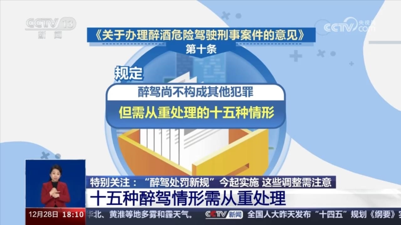 央視網(wǎng)消息:12月28日開(kāi)始,《關(guān)于辦理醉酒危險(xiǎn)駕駛刑事案件的意見(jiàn)》,俗稱“醉駕處罰新規(guī)”正式實(shí)施。此前,《意見(jiàn)》由最高人民法院、最高人民檢察院、公安部、司法部聯(lián)合發(fā)布。