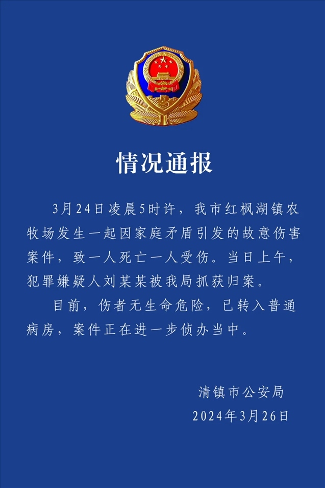 央視網(wǎng)消息:據(jù)貴州清鎮(zhèn)市公安局,3月24日凌晨5時(shí)許,清鎮(zhèn)市紅楓湖鎮(zhèn)農(nóng)牧場(chǎng)發(fā)生一起因家庭矛盾引發(fā)的故意傷害案件,致一人死亡一人受傷。