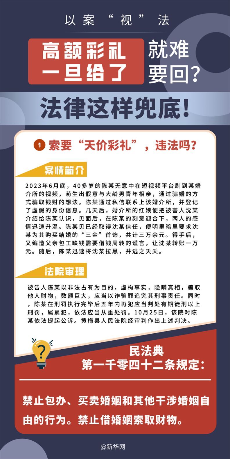 “五一”長假期間,各地迎來了婚禮高峰期,“彩禮”話題,尤其農(nóng)村高額彩禮現(xiàn)象備受關(guān)注。破解高價彩禮,在解決爭議的層面,司法盡了最大努力兜底。本期《以案“視”法》針對涉“高額彩禮”糾紛,帶大家學(xué)習(xí)相關(guān)法律知識。