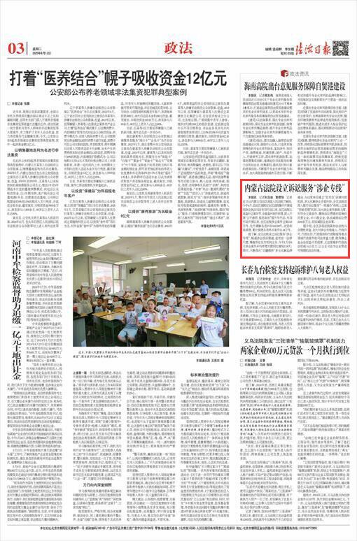 2025年8月12日,《法治日報》第3版刊發(fā)題為《內蒙古法院設立訴訟服務“涉企專線”》的文章,報道了自治區(qū)高院在全區(qū)法院集中開展規(guī)范涉企執(zhí)法司法專項行動以來,全區(qū)法院認真查糾立案環(huán)節(jié),全面查糾案件審理,深入開展“公開透明 規(guī)范高效”提升年行動。