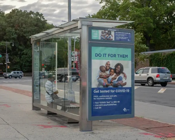 △美國(guó)紐約布魯克林一個(gè)公交車(chē)站的免費(fèi)核酸檢測(cè)廣告 (圖片來(lái)源:《紐約時(shí)報(bào)》)