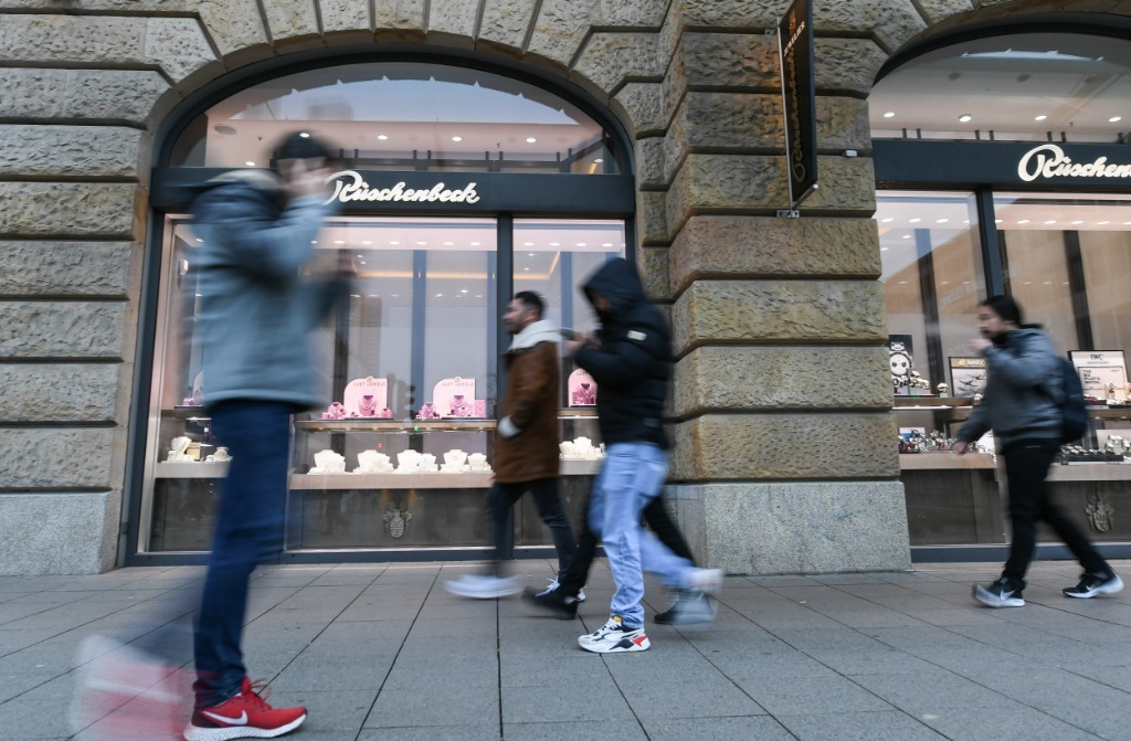 1月15日,行人從德國法蘭克福一家商場的櫥窗前走過。新華社記者逯陽攝
