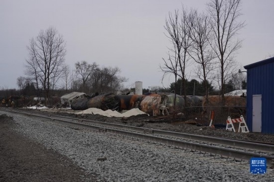 這是2月14日在美國俄亥俄州東巴勒斯坦鎮(zhèn)拍攝的脫軌列車殘骸。新華社發(fā)(章焱飛攝)