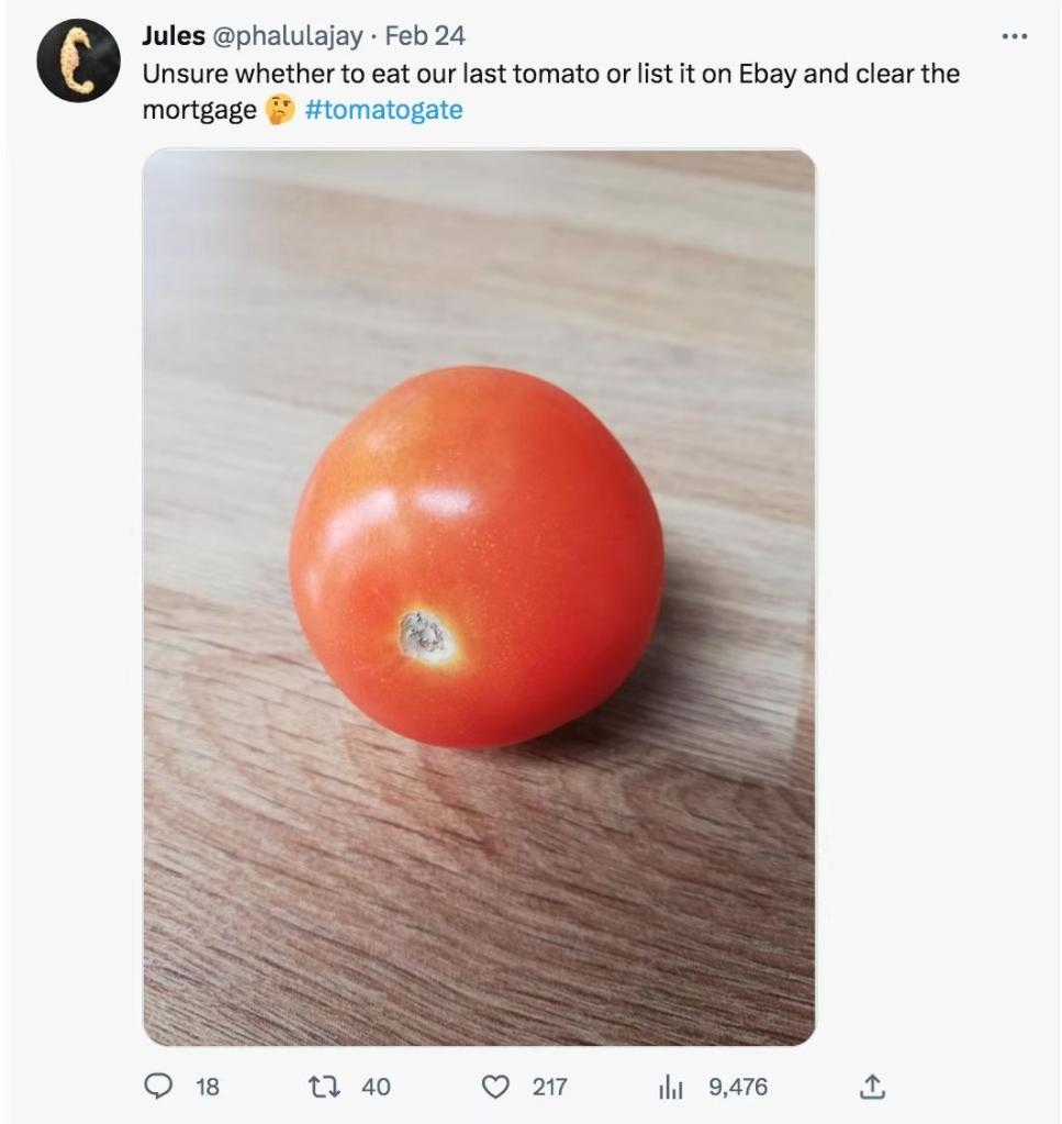 有英國(guó)網(wǎng)友在社交媒體上公布的賬單顯示,2月末他花費(fèi)了25英鎊(折合人民幣206.53元)購(gòu)買了一袋共6個(gè)西紅柿。還有英國(guó)網(wǎng)友調(diào)侃說(shuō),看著家里最后一個(gè)西紅柿,難以決定是把它吃掉,還是把它賣掉還房貸。