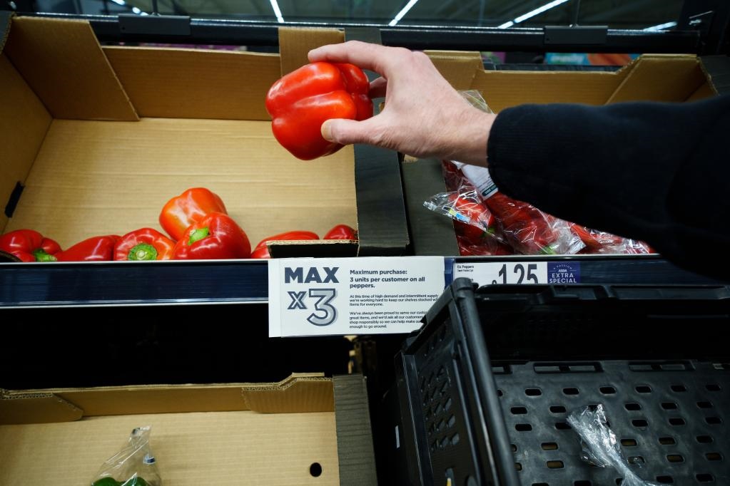 這是2月23日在英國(guó)曼徹斯特一家超市拍攝的蔬菜貨架上的限購(gòu)?fù)ㄖ?。按照通知,每名顧客一次只能最多?gòu)買3個(gè)彩椒。新華社發(fā)(喬恩·休珀攝)