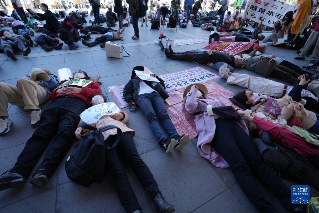 當(dāng)日,300多名民眾聚集在會展中心門前,高喊“拒絕為戰(zhàn)爭準(zhǔn)備”“拒絕死亡商人”“反對戰(zhàn)爭”等口號強(qiáng)烈抗議日本強(qiáng)化武器交易??棺h演講之后,民眾還集體倒地,以行為語言以示抗議。