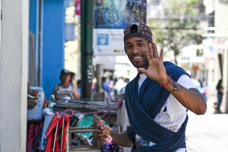 3月26日,一名男子在洪都拉斯首都特古西加爾巴一處街道上面對(duì)鏡頭揮手致意。新華社記者辛悅衛(wèi)攝