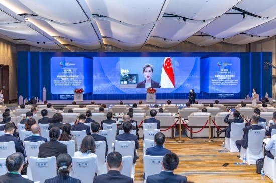 2023年4月20日,在重慶市第五屆中新(重慶)戰(zhàn)略性互聯(lián)互通示范項(xiàng)目金融峰會開幕式現(xiàn)場,新加坡通訊及新聞部部長、內(nèi)政部第二部長楊莉明線上致辭。新華社記者 黃偉 攝