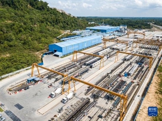 這是4月26日在馬來(lái)西亞吉蘭丹州拍攝的馬東鐵項(xiàng)目一分部制梁場(chǎng)(無(wú)人機(jī)拍攝)。新華社記者 朱煒 攝