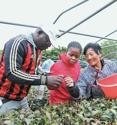 4月21日,在山東泰安道朗鎮(zhèn),非洲青年代表向茶農(nóng)學習采摘知識。本報記者 陳尚文攝