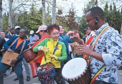 4月22日,在山東青島八大關街道,非洲青年代表與當?shù)厣鐓^(qū)文藝隊成員熱情互動。本報記者 陳尚文攝