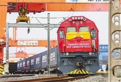 中歐班列是中法進出口貿(mào)易的重要橋梁。圖為4月26日,為紀念成都國際班列十周年而開行的“法國郵政DPD專列”在四川省成都市青白江區(qū)國際鐵路港首發(fā)。白桂斌攝(人民視覺)