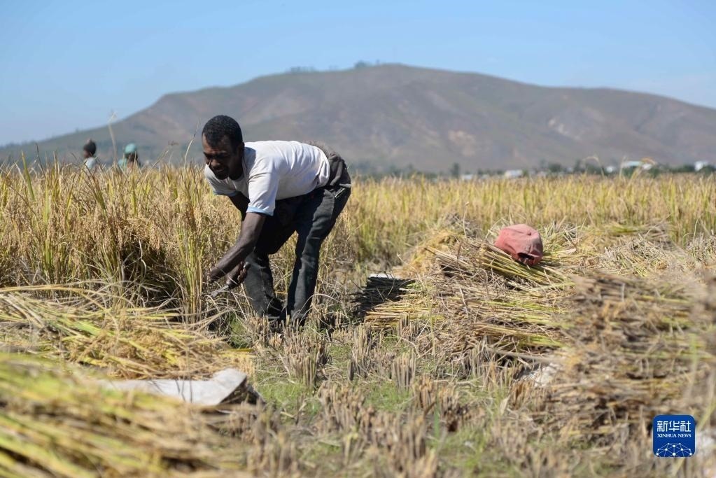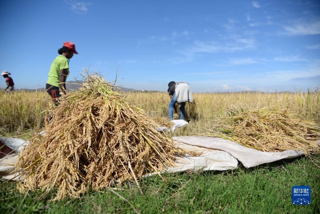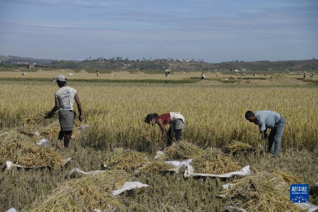 5月12日,在馬達(dá)加斯加首都塔那那利佛附近馬希奇鎮(zhèn)的中國(guó)國(guó)家雜交水稻工程技術(shù)研究中心非洲分中心,當(dāng)?shù)剞r(nóng)民在雜交水稻高產(chǎn)示范田內(nèi)收割水稻。