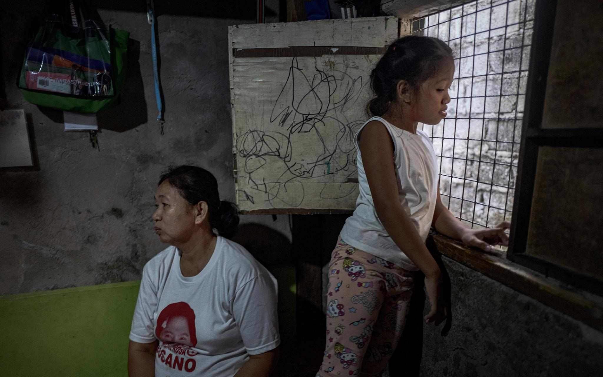 當?shù)貢r間2023年4月15日,菲律賓馬尼拉,奎松市,Corazon Mercado(左)和她的女兒Bea坐在家里。據(jù)Corazon Mercado說:“我們買不起大瓶或散裝的必需品,我們只能買得起小袋的日常必需品?!?/p>