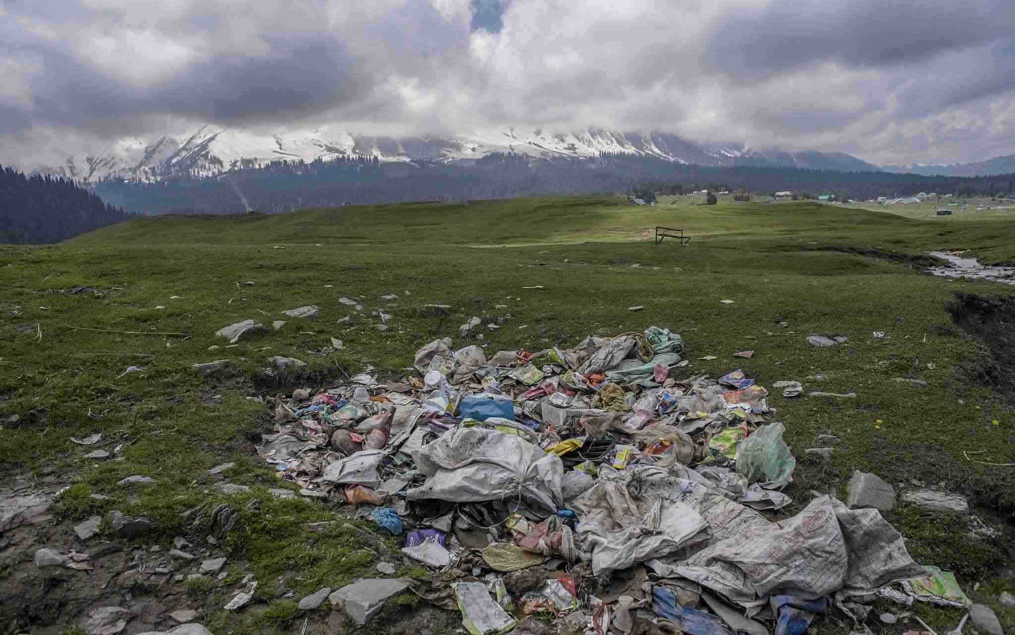 古爾瑪格,著名的滑雪勝地。在夏天,這個勝地擠滿了避暑的游客并留下了大量的垃圾。垃圾的堆積對高山生態(tài)造成了嚴重威脅,也對冰川溪水造成了嚴重威脅。盡管指示牌提醒人們禁止攜帶塑料,但對攜帶食物和水沒有限制。環(huán)保人士警告說,古爾瑪格及其周邊地區(qū)的到處都是被丟棄的塑料垃圾。