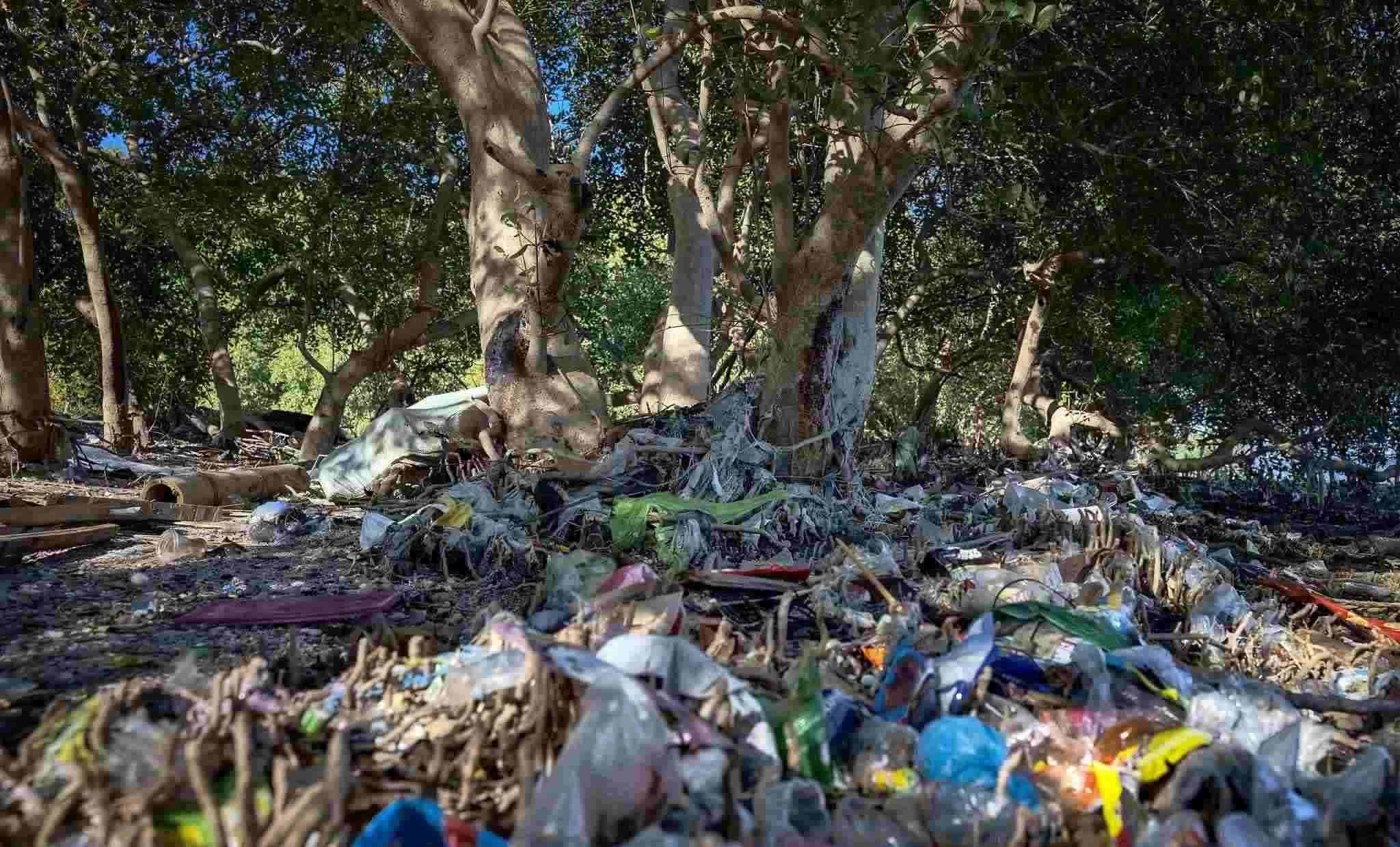 當?shù)貢r間2023年4月19日,菲律賓馬尼拉,帕拉納克,自由島紅樹林上的塑料垃圾。