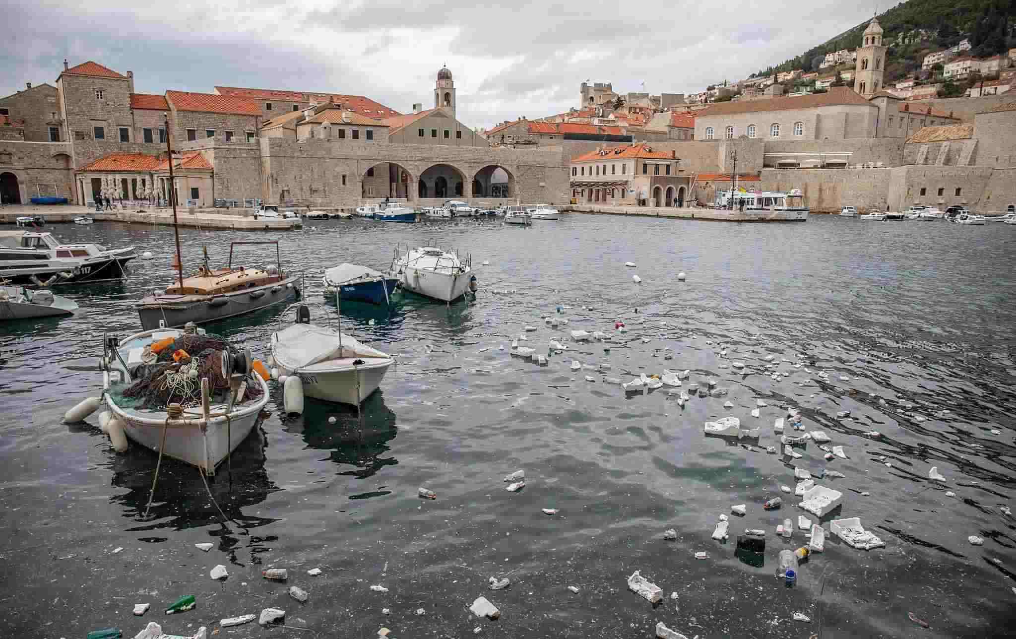 當?shù)貢r間2023年2月27日,克羅地亞杜布羅夫尼克,大風過后,塑料垃圾漂浮在舊城港口。