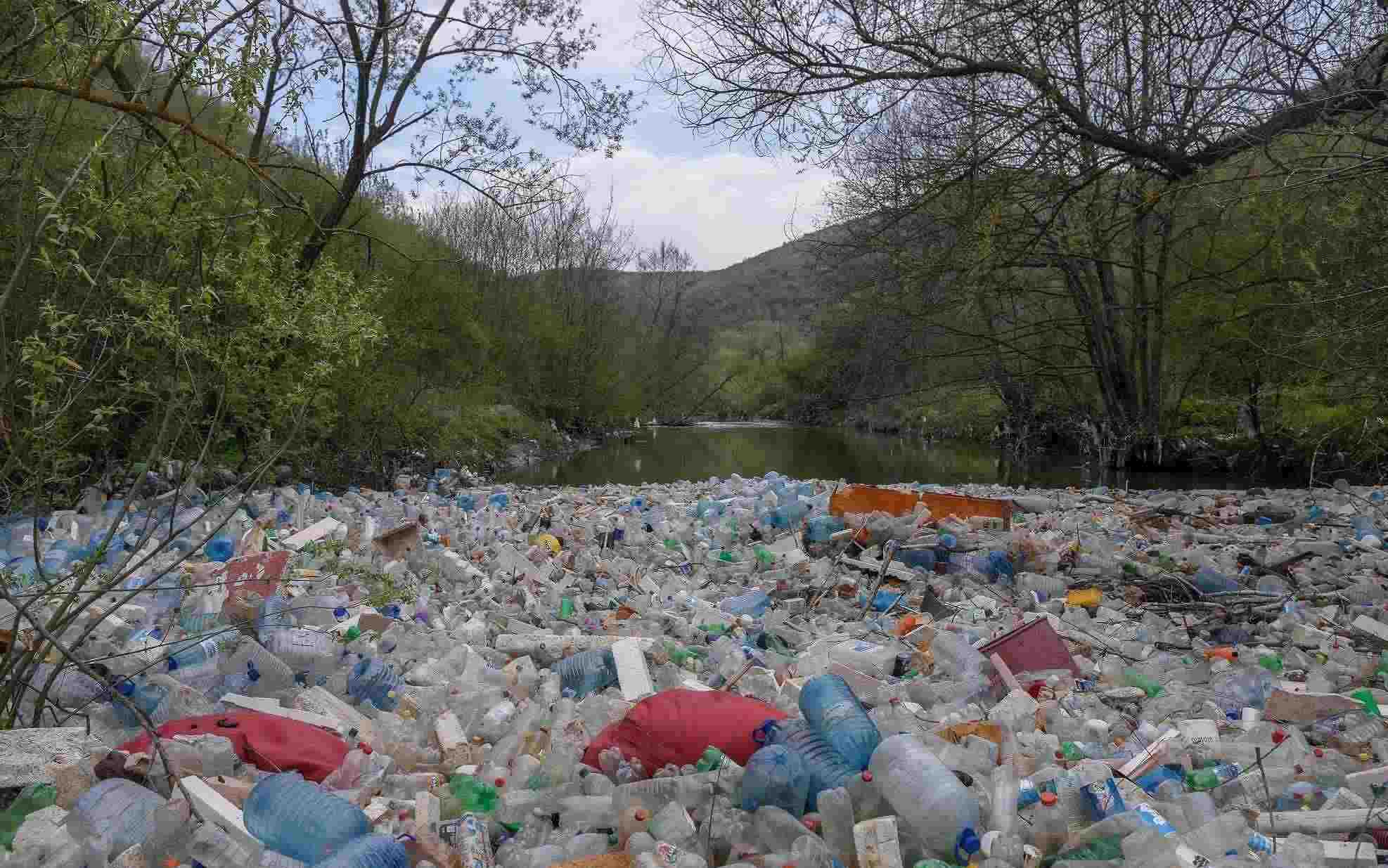 當?shù)貢r間2023年4月22日,科索沃地區(qū),摩拉瓦河漂浮著大量廢棄的塑料瓶和其他垃圾。
