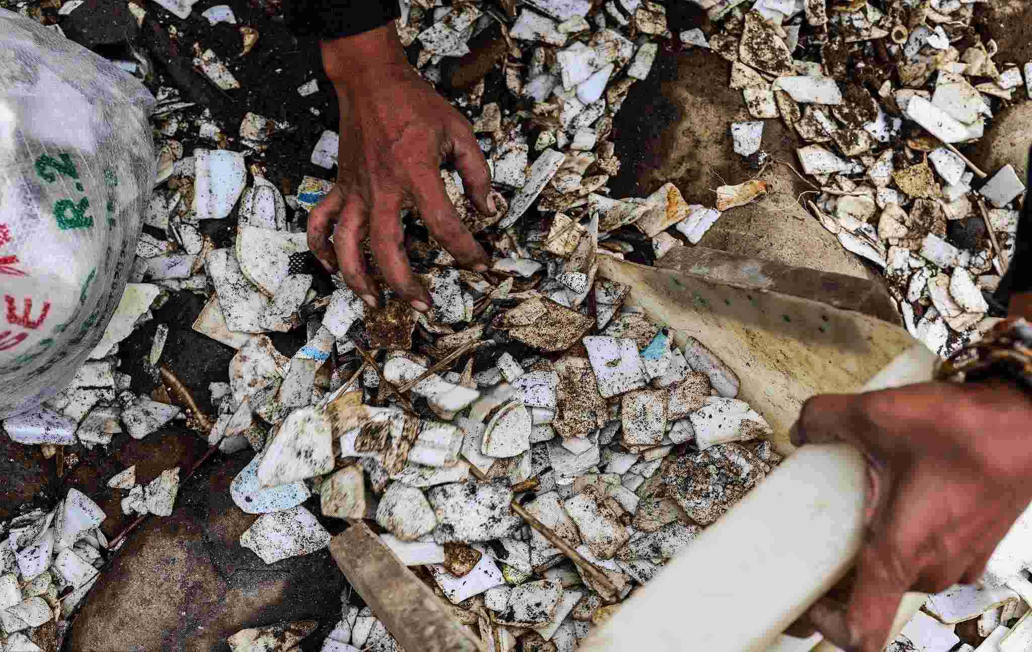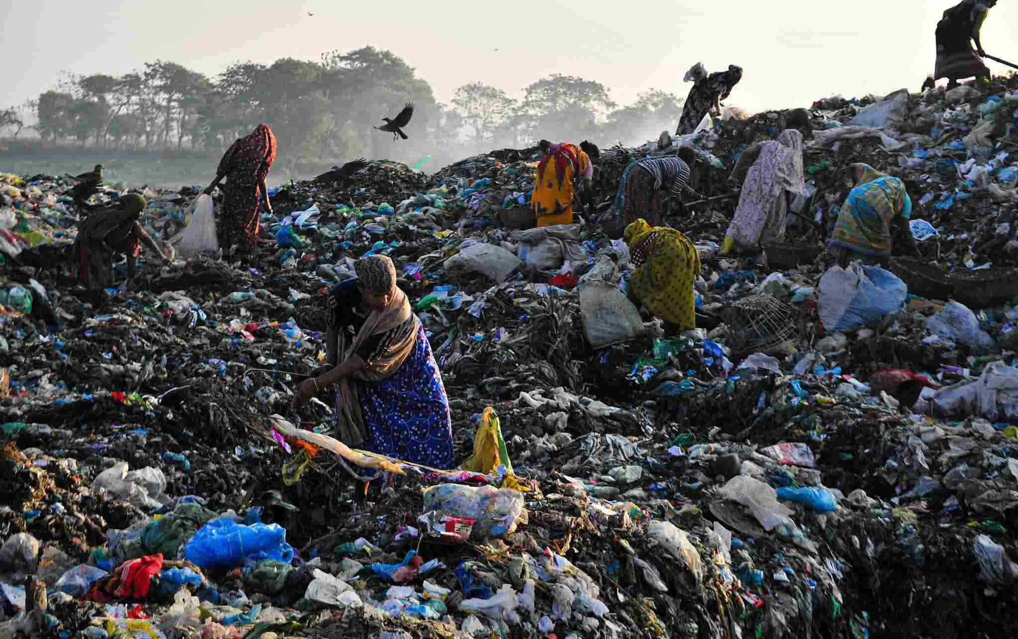 當?shù)貢r間2023年1月2日,孟加拉國錫爾赫特,工人們在一個有毒廢物傾倒場工作。