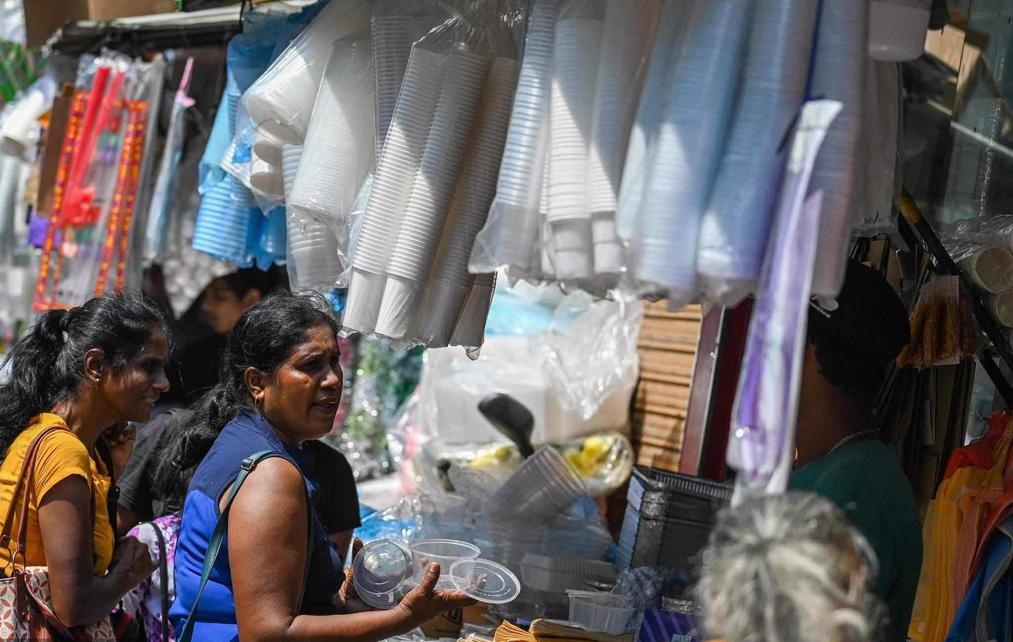 當?shù)貢r間2023年2月14日,斯里蘭卡科倫坡市場的一家商店里,顧客在購買塑料餐具。