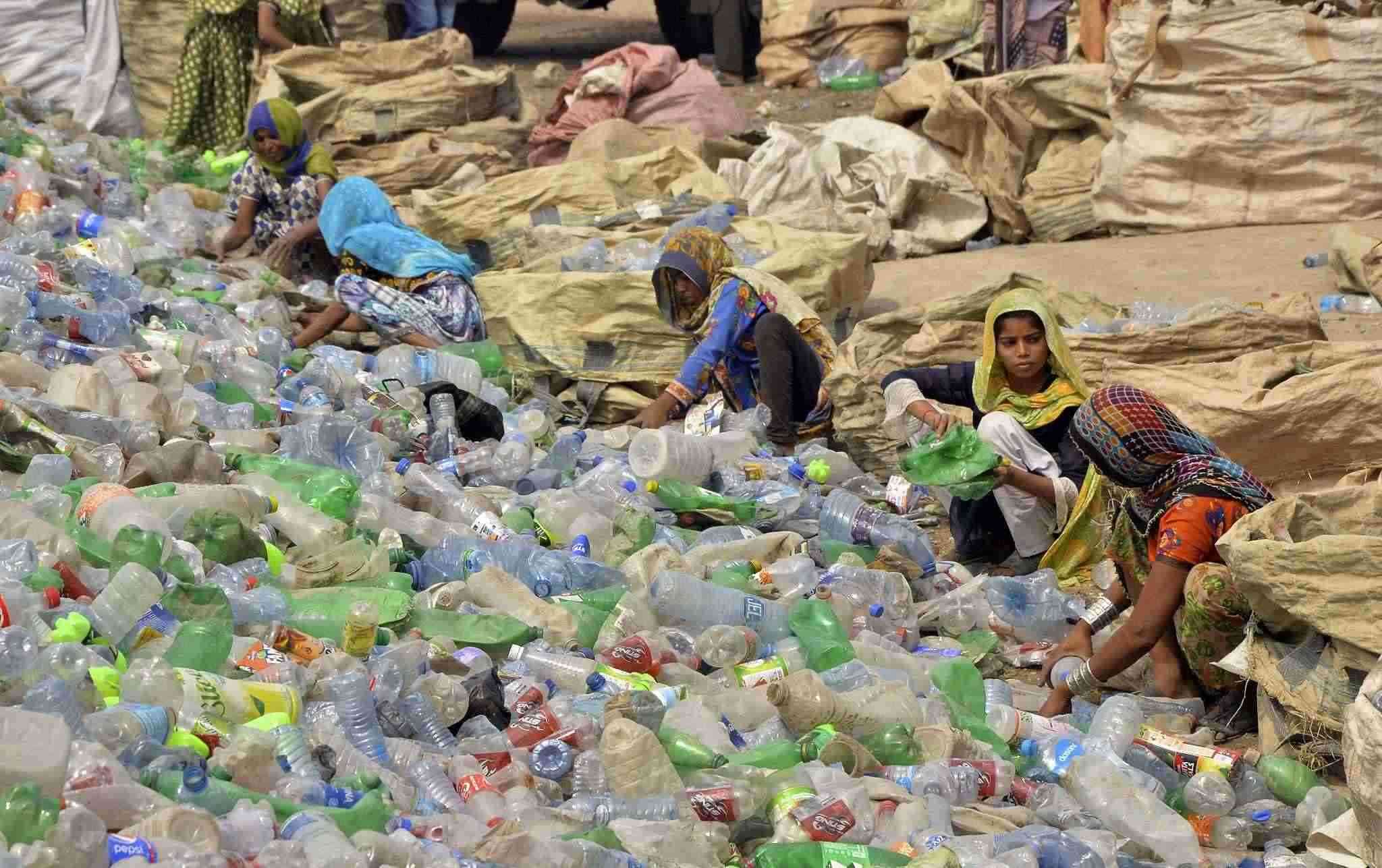 當?shù)貢r間2023年4月30日,巴基斯坦海得拉巴,婦女們在一家塑料回收工廠里整理空瓶子。