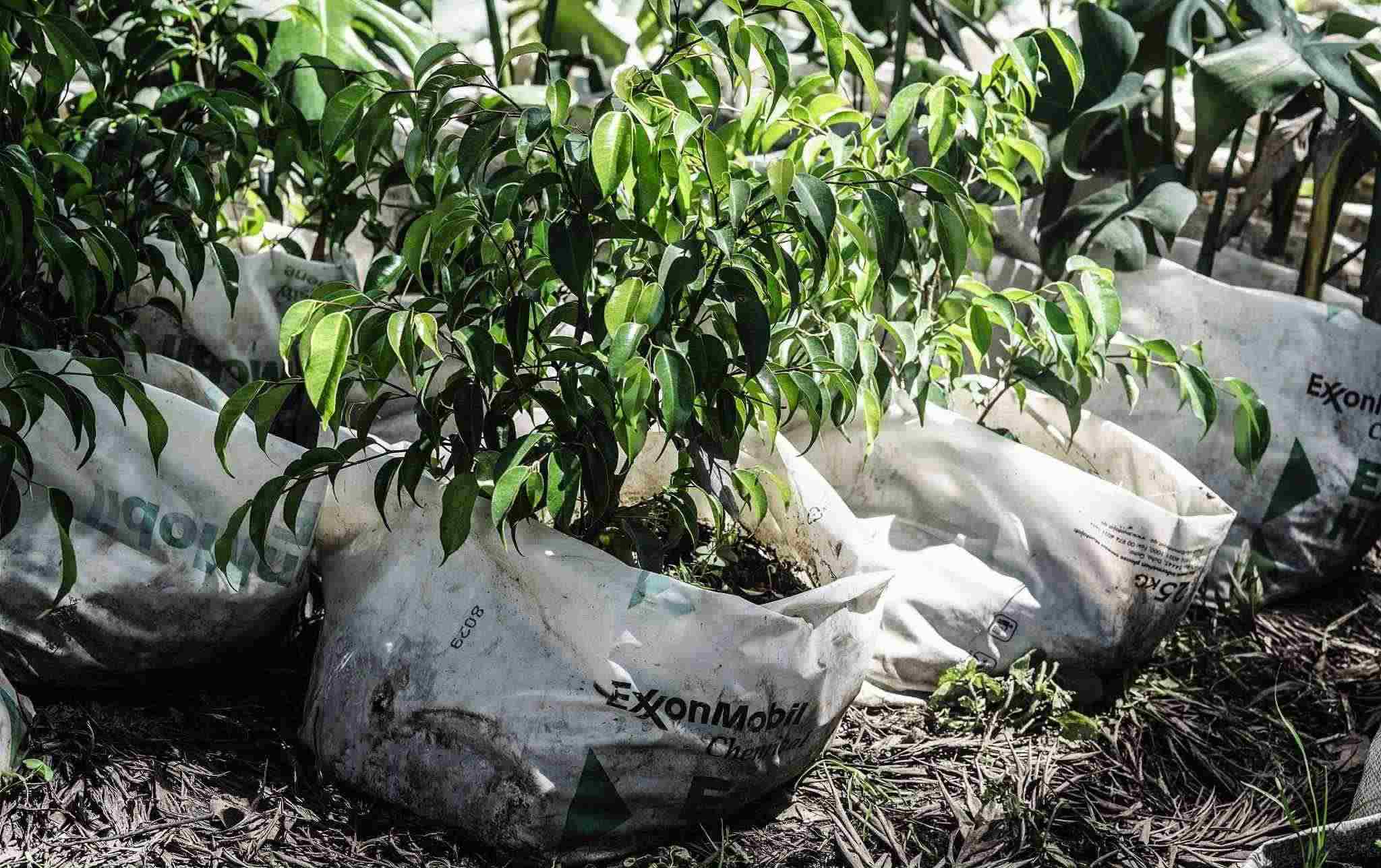 當?shù)貢r間2023年5月7日,肯尼亞納庫魯?shù)拿缙岳铮?松梨诎b袋包裹著一棵樹苗。隨著世界充斥著塑料廢物,政府間談判委員會(INC)內塑料條約的支持者正在倡導一項具有法律約束力的文書,減少石化工業(yè)生產的原生塑料。