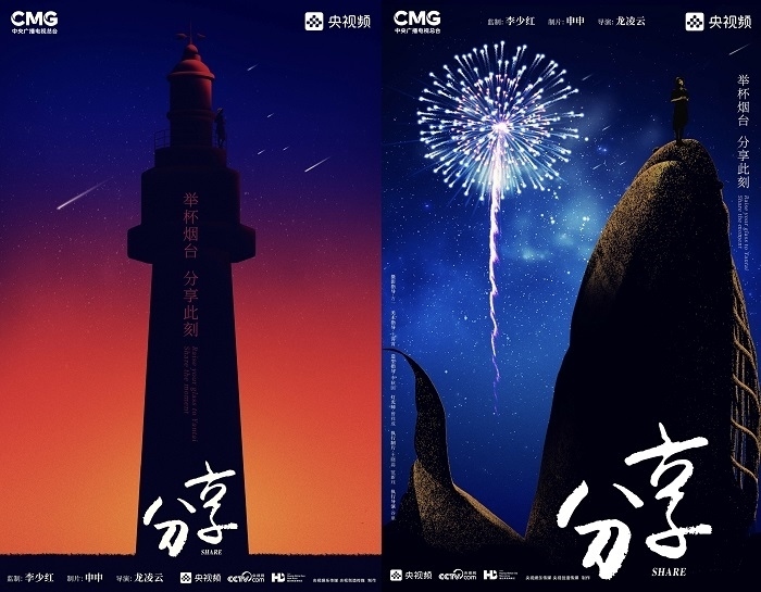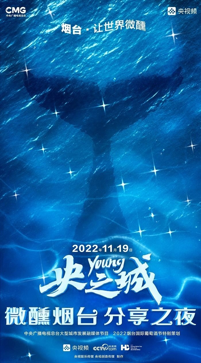 田雨峰在拍攝短片海報(bào)用圖的時(shí)候,首先確定了畫(huà)面中最突出的形象元素,同時(shí)也是交代短片故事發(fā)生地的地標(biāo)性雕塑——“孤獨(dú)的鯨“。這個(gè)雕塑如今是煙臺(tái)開(kāi)發(fā)區(qū)金沙灘的網(wǎng)紅打卡地,網(wǎng)友為其起名”鯨落“。碩大的鯨魚(yú)從淺海處躍出海面,魚(yú)頭和魚(yú)尾凌空飛躍,其身體的一部分似藏在沙灘里。這是一個(gè)在真實(shí)生活中不會(huì)出現(xiàn)的景象,充滿了動(dòng)畫(huà)般的奇幻想象,位于煙臺(tái)碧藍(lán)的海邊,又天然地帶上了一點(diǎn)浪漫的色彩。短片中”舉杯煙臺(tái),分享此刻“的Slogan綴在尾聲,分享的正是煙臺(tái)這座城市獨(dú)有的沙灘、夜空、煙火和人間。短片中可以娓娓道來(lái)般逐漸交代,但在海報(bào)里,二環(huán)用畫(huà)面底部金色沙灘上”孤獨(dú)的鯨“,畫(huà)面上方如大海般湛藍(lán)的星空,星空中綻放的煙花,鎖定了地球上唯一的煙臺(tái)。田雨峰鏡頭中短片主角的人物照被二環(huán)拼貼到童話般色彩斑斕的畫(huà)面里,被著意縮小了的黑色小女孩于是成為一切奇幻、浪漫想象的迸發(fā)之源,和世界分享一個(gè)妙趣橫生的想法。