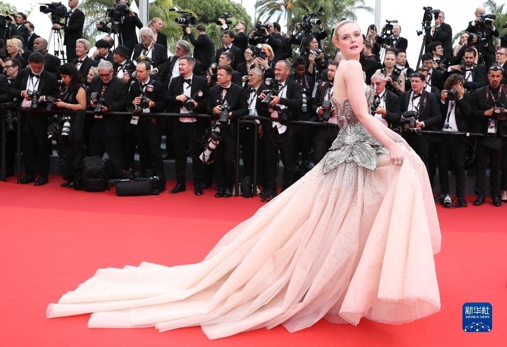5月16日,在法國戛納舉行的第76屆戛納國際電影節(jié)上,演員埃勒·范寧亮相紅毯。   新華社記者 高靜 攝